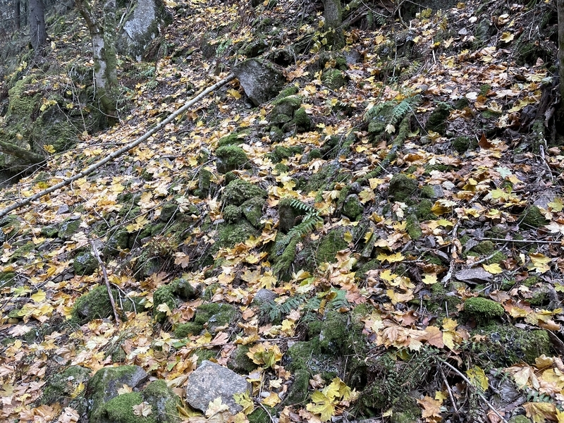 最初、落石の警告を見た時はこの辺りが危ないのかと思っていましたが、このあたりの細かい石は既に落ち切っている印象でした。