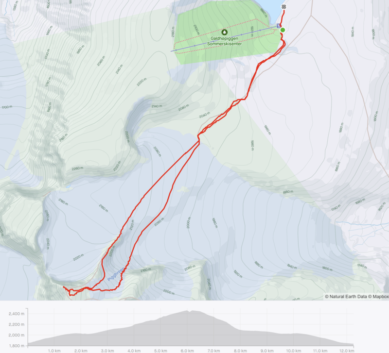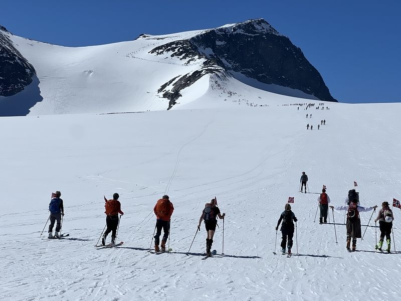 Galdhøpiggenを目指すルートの中では夏の登山でも山スキーでも最短ルートですが、氷河上を歩くので、クレバスなどに落ちる危険のある時期はガイド同伴・氷河装備が推奨されています。