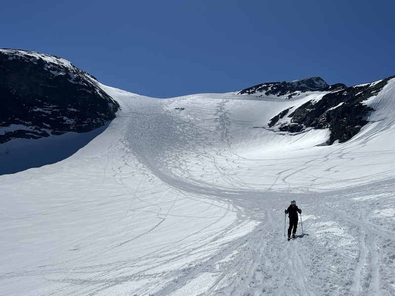 雪が柔らかい日だったので怖くなかったですが、山スキー板ではなく、BCクロカンやクロカン板などを使っている人はStyggbrean来た道をそのまま帰っている人が多かったです。