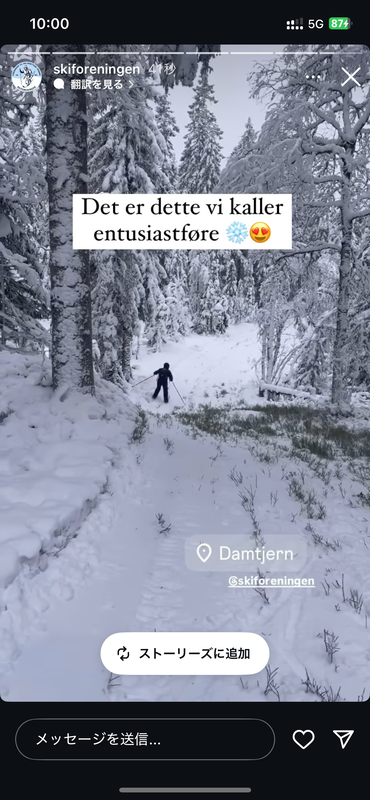 Damtjernを滑った後、インスタのストーリーで草の中を滑っている動画をあげたら「Det er dette vi kaller entusiastføre」=これがいわゆる熱狂的な行動です とのコメント付きでSkiforeningenのアカウントに引用されて笑ってしまいました。